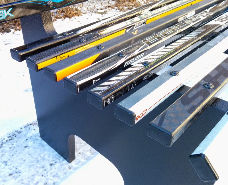 An upgraded hockey stick bench featuring a full backrest. Multiple design variations shown.