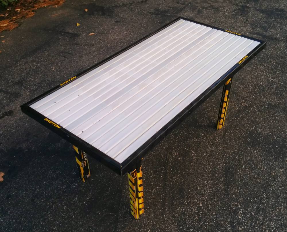 A coffee table built from composite hockey sticks with angled legs. A modern, sleek variation on the classic hockey table.