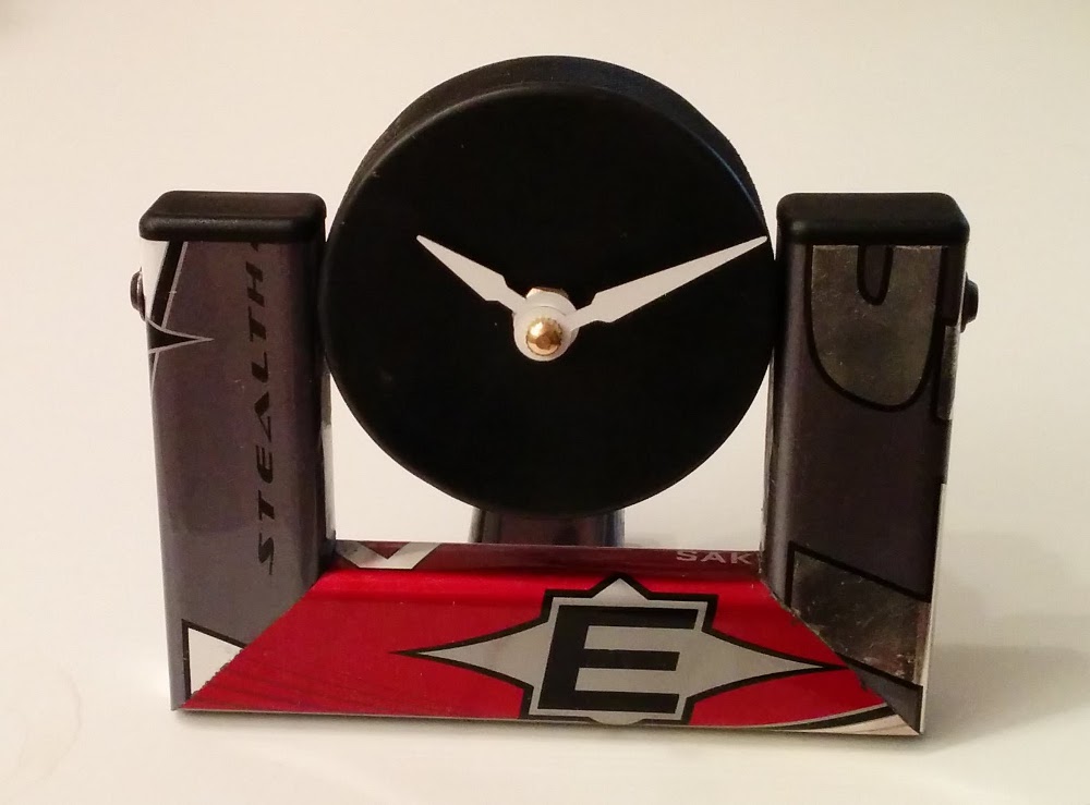 A compact desk clock using a single hockey stick and a hockey puck with clock movement. Great beginner project for clock-making.