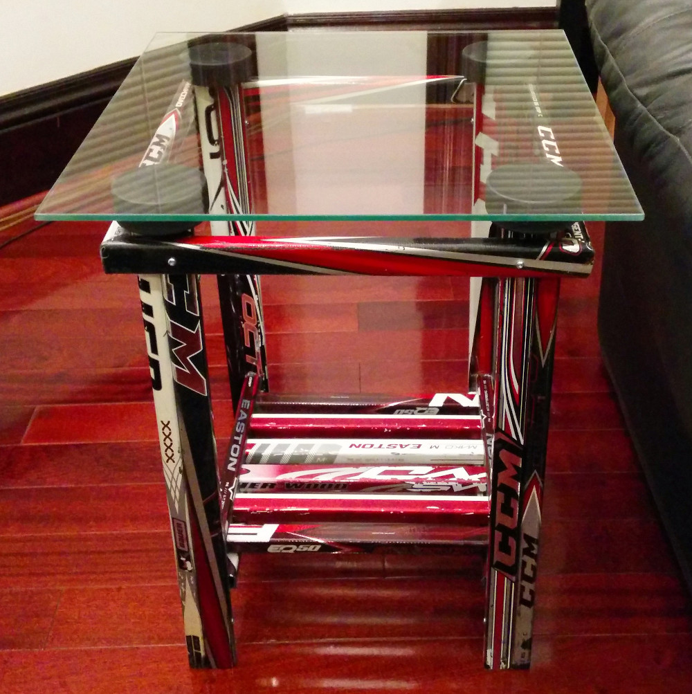 Compact end tables built from hockey sticks, available in multiple color schemes. Perfect as side tables or nightstand alternatives.