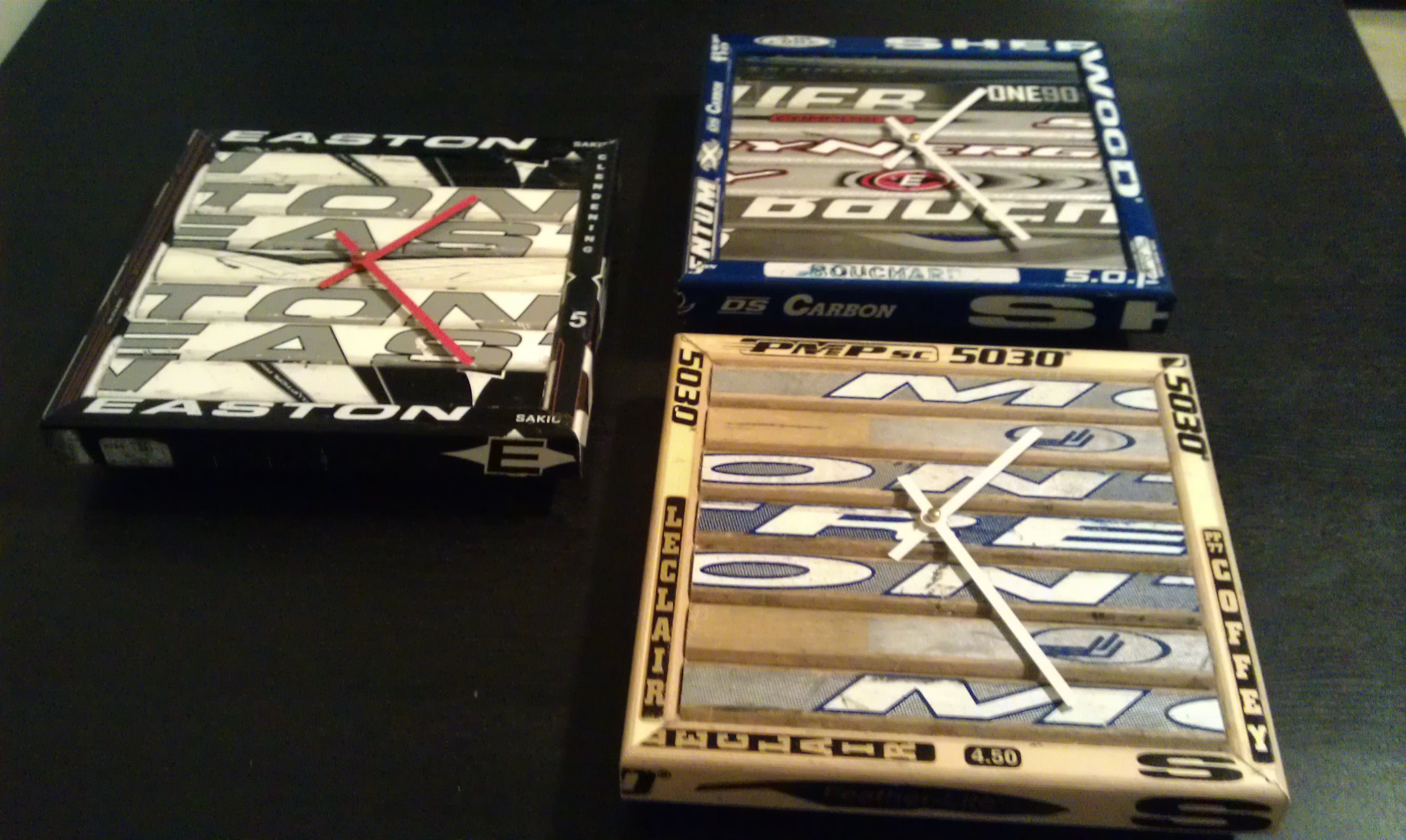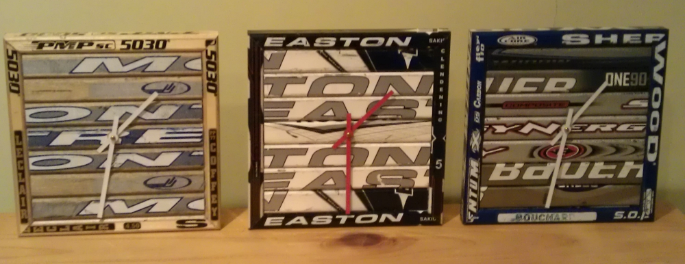 A wall-mounted clock made from hockey pucks with stick frame. Features a three-puck design with routed center for the clock movement.