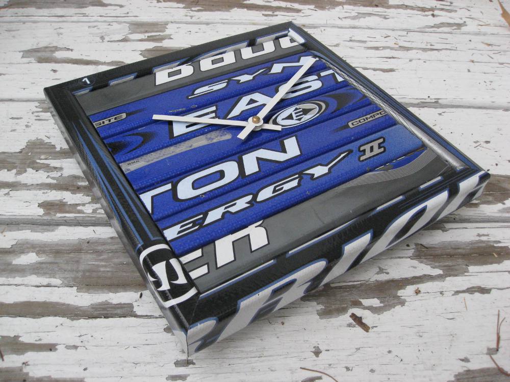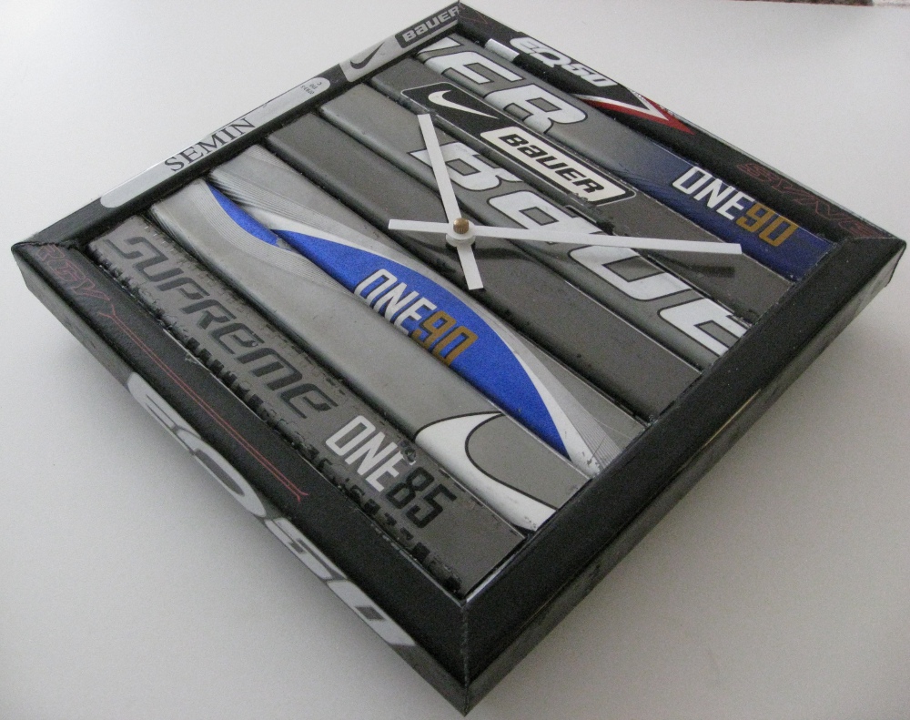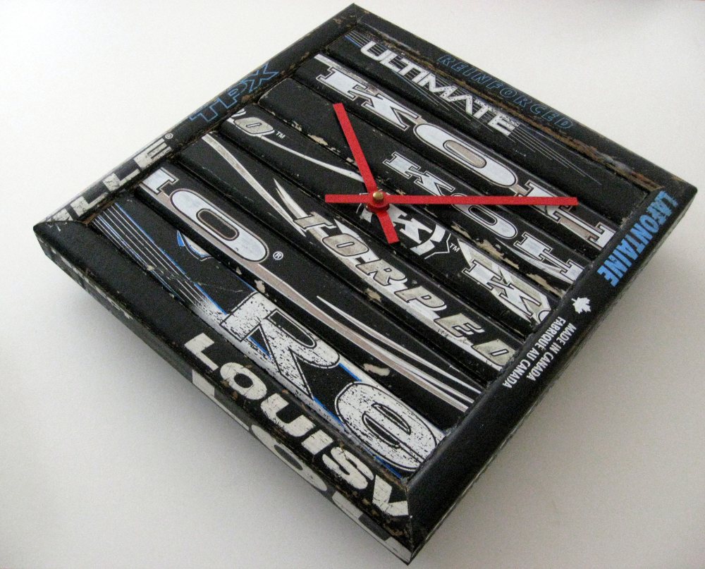 A wall clock combining hockey sticks and pucks into a striking display piece. Available in team-themed variations.